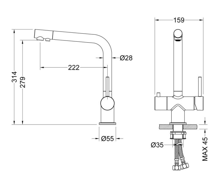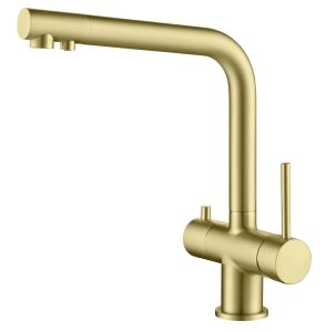 Цвет "матовое золото" никогда не выйдет из моды, во все времена драгоценный металл был признаком богатства. Смеситель Timo Saona 2396 с системой подключения фильтрованной воды относится к премиальному сегменту, предназначен для монтажа на кухонную мойку или столешницу. Высокий излив подходит для моек с двумя чашами, а также позволяет справляться с мытьем габаритной посуды. Удобное (вертикальное) расположение рычага смесителя в крайнем положении "холодный старт", позволяет не задевать ручкой за стеновые панели, фартук, предметы, которые находятся за смесителем. Картридж с функцией "холодный старт" работает в диапозоне 90 градусов, рычаг установленный в исходное положение (вертикально) при открытии подает только холодную воду, а не 50% холодной воды плюс 50% горячей, позволяя экономить до 30% расход горячей воды. В нижней части смесителя установлены 2 трубки с адаптером (можно подключиться к любой из них) для соединения с трубкой фильтра. Подача фильтрованной воды осуществляется поворотом ручки дивертора, расположенной слева на корпусе смесителя (от себя или на себя) в зависимости от того какую из трубок вы выбрали для подключения с трубкой фильтра. Вставьте заглушку (входит в комплект) до упора в свободную трубку. Положение 12-00 дивертор выключен. Сложностей монтажа не возникает при установке смесителя опытным сантехником. Внимательно изучите инструкцию по монтажу и эксплуатации.