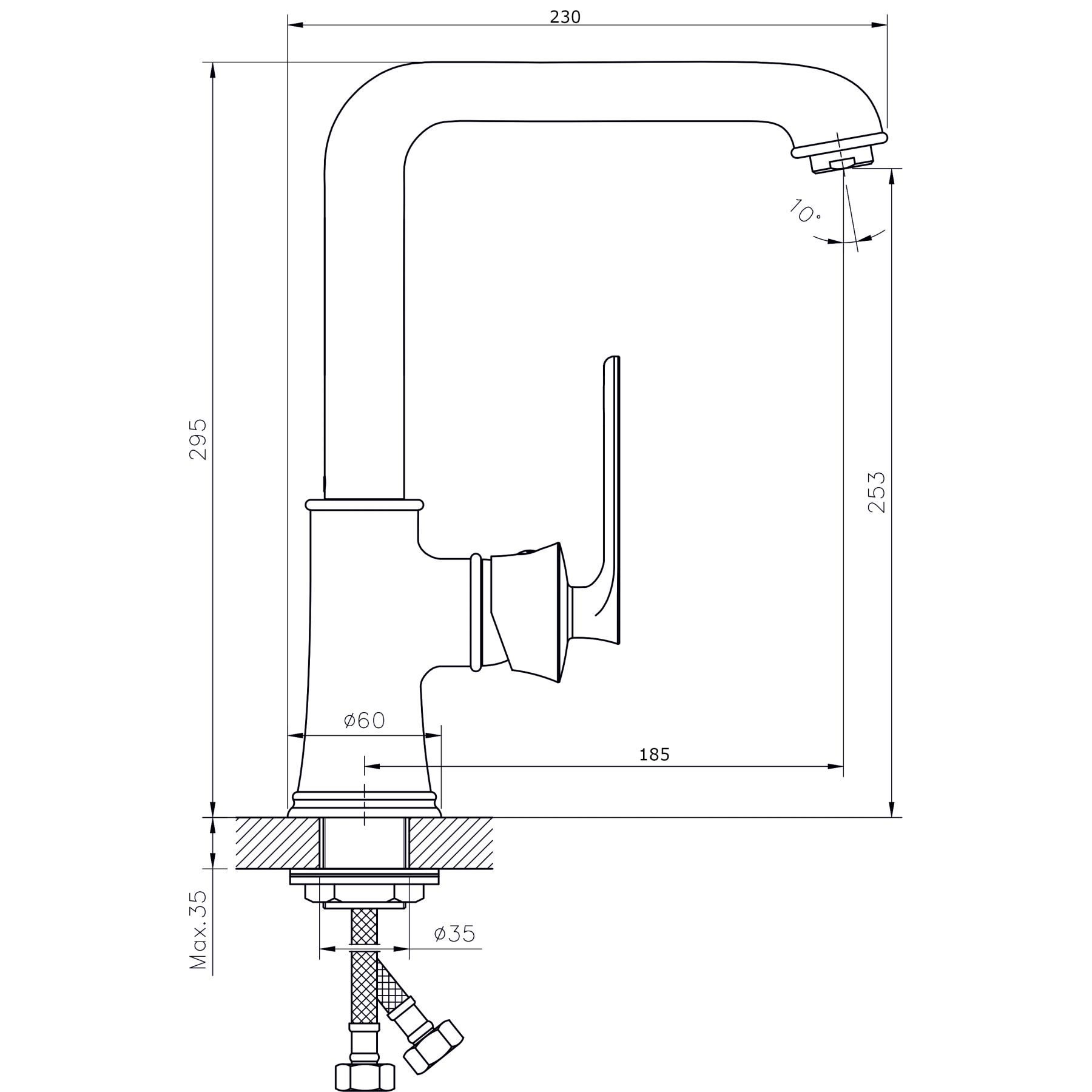 Смеситель для кухни с поворотным изливом RUSH арт. FL0835-22 с металлической ручкой из коллекции Flores изготовлен из высококачественной латуни и имеет рычажное управление.В смеситель установлен картридж D-35 с керамическими пластинами. Высота смесителя 295 мм. Излив поворотный, 185 мм. Высота излива до аэратора 253 мм. Аэратор изготовлен из пластика с нержавеющим корпусом, угол наклона аэратора- 10 гр. В комплекте гибкая подводка с латунными гайками 45 см - 2шт, универсальная присоединительная группа для установки на горизонтальную поверхность, фум-лента, индивидуальный пакет, паспорт, гарантийный талон.