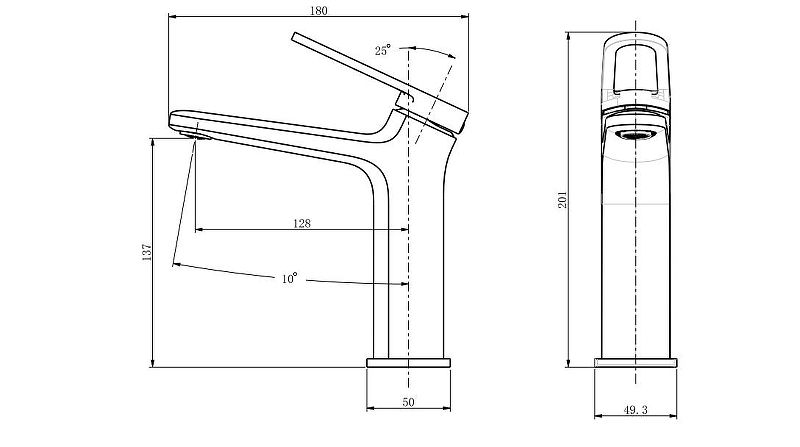Смеситель для раковины датского производителя Black&White в цвете глянцевый хром. Материал корпуса– сантехническая латунь, безопасный для здоровья и ресурсный сплав, обработанный с помощью гальваники. Управление потоками воды и настройка температуры осуществляется с помощью керамического картриджа. Важным функциональным и эстетическим решением стоит отметить возвышение излива на 10 градусов и ручки управления на 25 градусов относительно плоскости– это создает стремительные линии, а также минимизирует количество подтеков на корпусе когда Вы моете руки