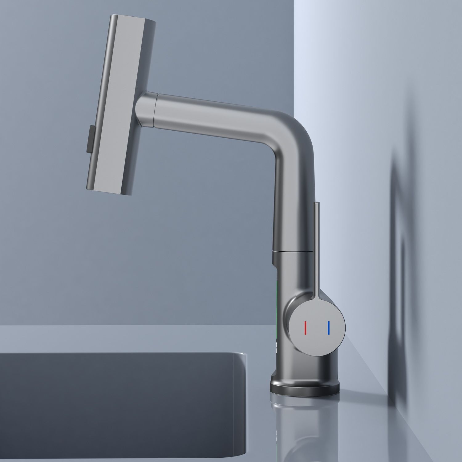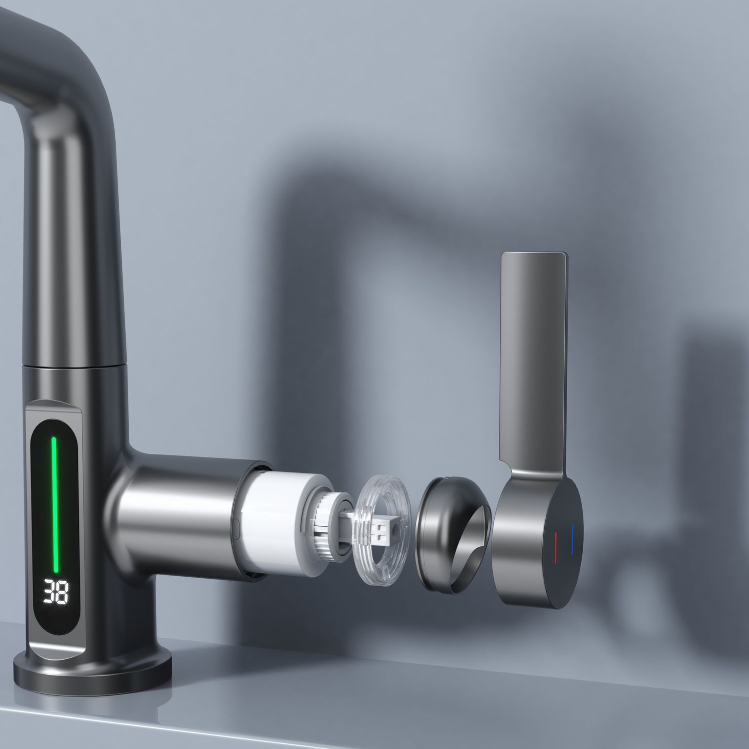 Смеситель для раковины датского производителя Black&White в цвете оружейная сталь. Корпус изделия выполнен из сантехнической латуни для увеличенного запаса прочности, а также исключает возможность появление коррозии. Управление потоком воды осуществляется с помощью керамического картриджа повышенной пропускной способности. Инновационным решением можно отметить электронное табло, расположенное в нижней части корпуса, на которое выводится показание температуры воды с подсветкой красного, зеленого и синего цвета. В данном продукте реализован многофункциональный излив с возможностью настройки высоты и длинны с помощью вытяжного шланга. Аэратор смесителя оборудован несколькими видами подачи воды, которые переключаются с помощью кнопки, расположенной сверху корпуса.