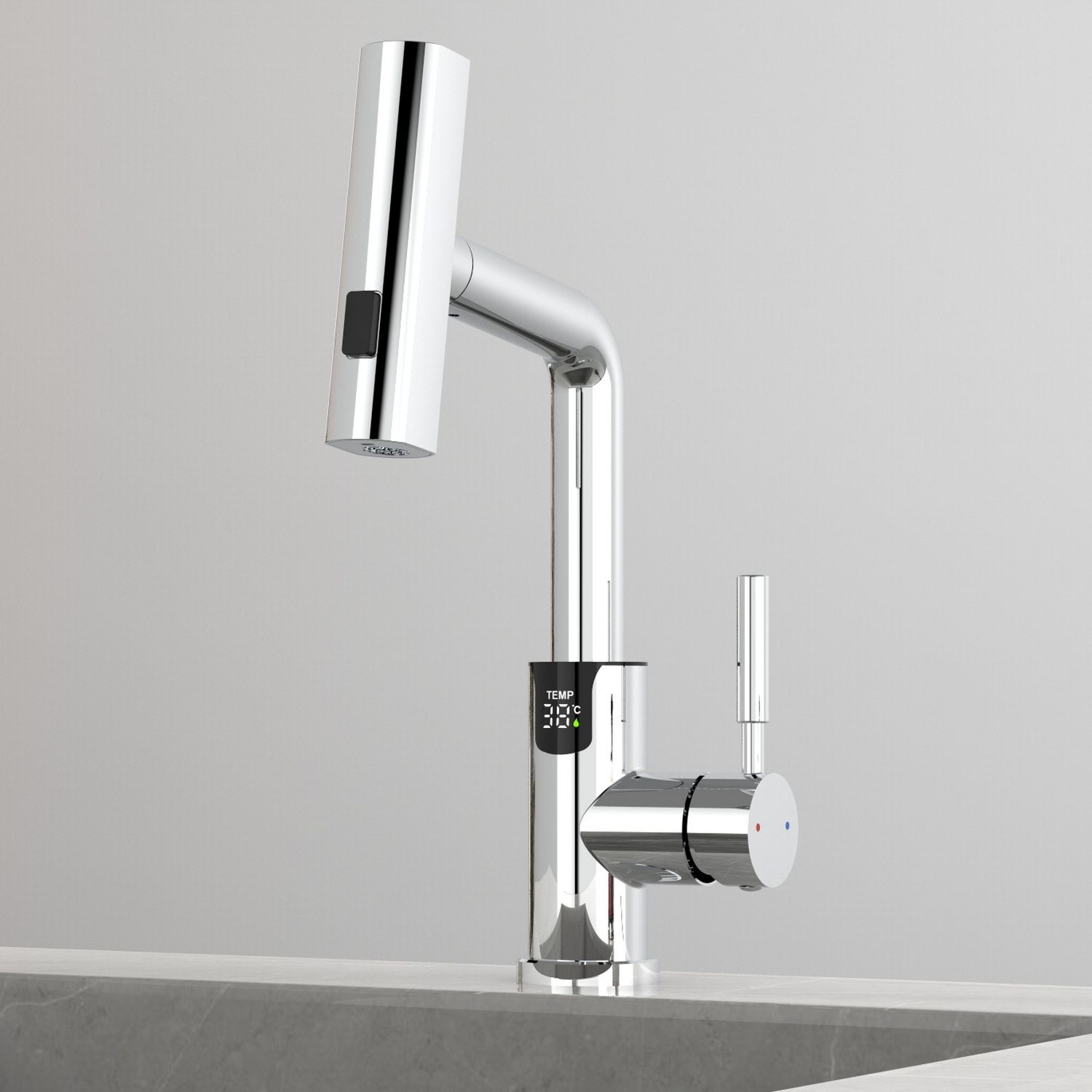 Смеситель для раковины датского производителя Black&White в цвете хром. В корпусе изделия прослеживаются нотки классических форм и современного стиля. Изготавливается из сантехнической латуни для увеличенного запаса прочности и исключения вероятности появление коррозии. Управление потоком воды осуществляется с помощью керамического картриджа повышенной пропускной способности. Инновационным решением можно отметить электронное табло, расположенное в нижней части корпуса, на которое выводится показание температуры воды с подсветкой красного, зеленого и синего цвета. В данном продукте реализован многофункциональный излив с возможностью настройки высоты и длинны с помощью вытяжного шланга. Аэратор смесителя оборудован несколькими видами подачи воды, которые переключаются с помощью кнопки расположенной сверху корпуса.