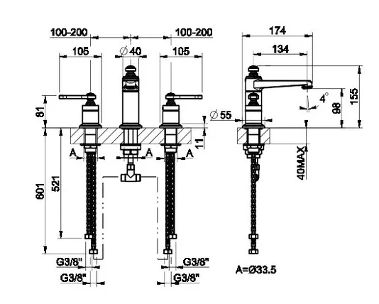 Смеситель для раковины Gessi Venti20 с двумя отдельными ручками управления предназначен для встраивания на три отверстия. Композиция подходит для оформления интерьеров в духе неоклассики и арт-деко.