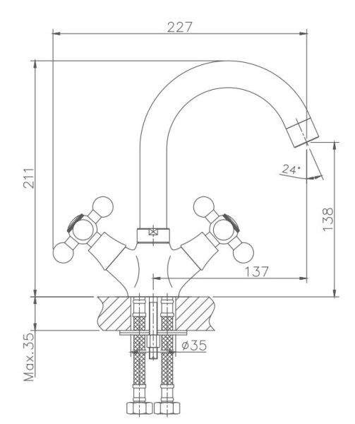 Смеситель для раковины Haiba.Изготовлен из латуни.Максимальная глубина монтажа 35 мм.Диаметр монтажного отверстия 35 мм.