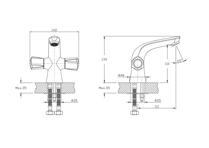Смеситель для раковины RUSH арт. PI7950-11 с металлической ручкой из коллекции Pioneer изготовлен из высококачественной латуни и имеет вентильное управление.В смеситель установлены кран-буксы (RSH502) с керамическими пластинами. Высота смесителя 135мм. Высота излива до аэратора 110 мм. Аэратор изготовлен из пластика с нержавеющим корпусом, угол наклона - 12 гр. В комплекте универсальная присоединительная (шпилька-2шт), гибкая подводка с латунными гайками 35см - 2шт, фум-лента, индивидуальный пакет, паспорт, гарантийный талон.