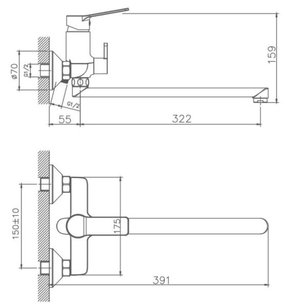 Керамический картридж 35 мм.Диаметр декоративных чашек 70 мм.Душевой гарнитур в комплекте.Межосевое расстояние (расстояние между выходом горячей и холодной трубы) 150 мм.Данное расстояние изменяется за счет входящих в комплект эксцентриков на 10 мм в большую или меньшую стороны.