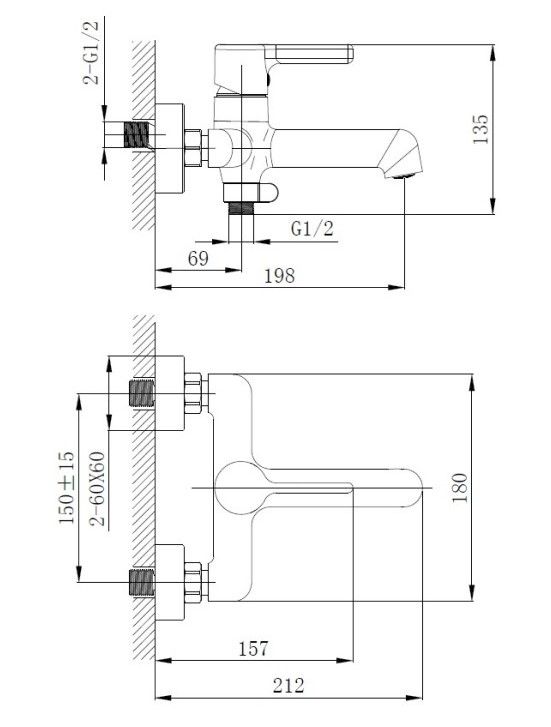 Керамический картридж 35 мм.Диаметр декоративных чашек 60 мм.Душевой гарнитур в комплекте.Межосевое расстояние (расстояние между выходом горячей и холодной трубы) 150 мм.Данное расстояние изменяется за счет входящих в комплект эксцентриков на 15 мм в большую или меньшую стороны.