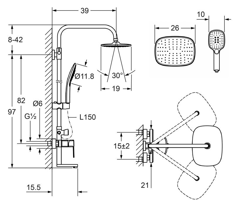 Комплектация - ручной душ, излив для набора воды, верхний душ