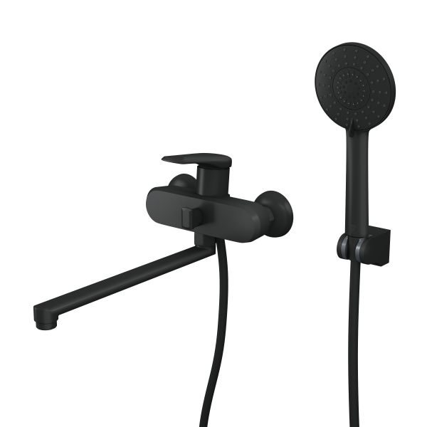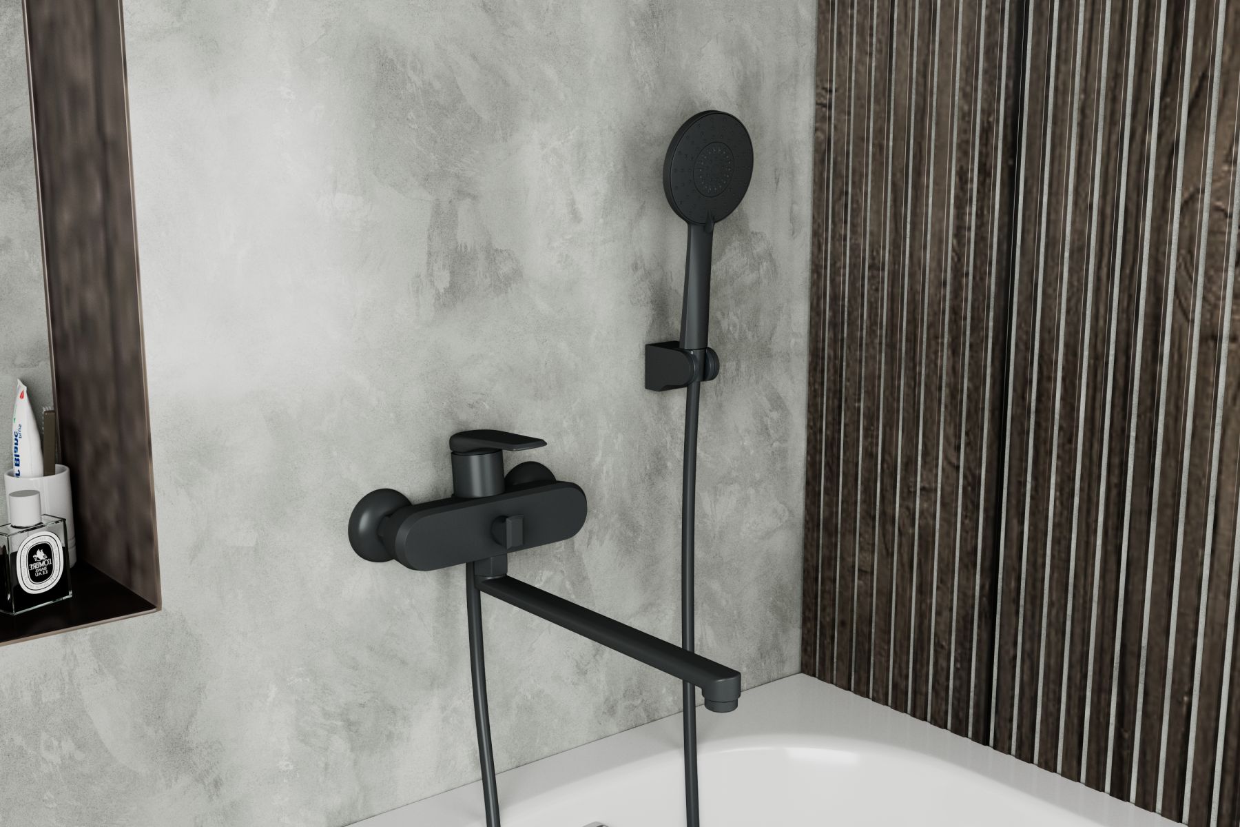 Смеситель для ванны RUSH арт. NE1735-51Black с поворотным изливом из коллекции Nevis изготовлен из высококачественной латуни и имеет рычажное управление. Излив изготовлен из нержавеющей сталиВ смеситель установлен картридж D-35 с керамическими пластинами, а также дивертор с керамическими пластинами. Пластиковый аэратор с нержавеющим корпусом. Излив поворотный 350 мм. В комплекте универсальная присоединительная группа для установки на вертикальную поверхнгость, однорежимная душевая лейка и душевой шланг длиной 1,5м., держать душевой лейки, нержавеющие эксцентрики фум-лента, индивидуальный пакет, паспорт, гарантийный талон.