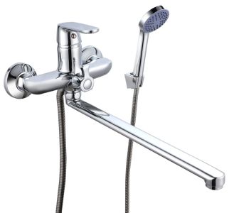 Смеситель для ванны с длинным изливом.Картридж: керамический 35мм.Евро-переключение на душ.Аэратор: пластиковыйПокрытие: хром.В комплекте: эксцентрики, отражатели, металлический шланг для душа 1,5м, лейк