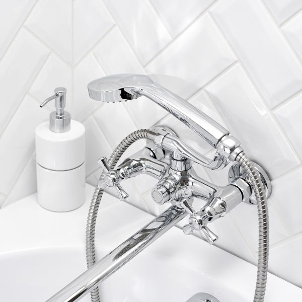 Современный двуручковый смеситель для ванны с длинным поворотным изливом притягивает внимание геометричностью линий и стильным хромированным покрытием.