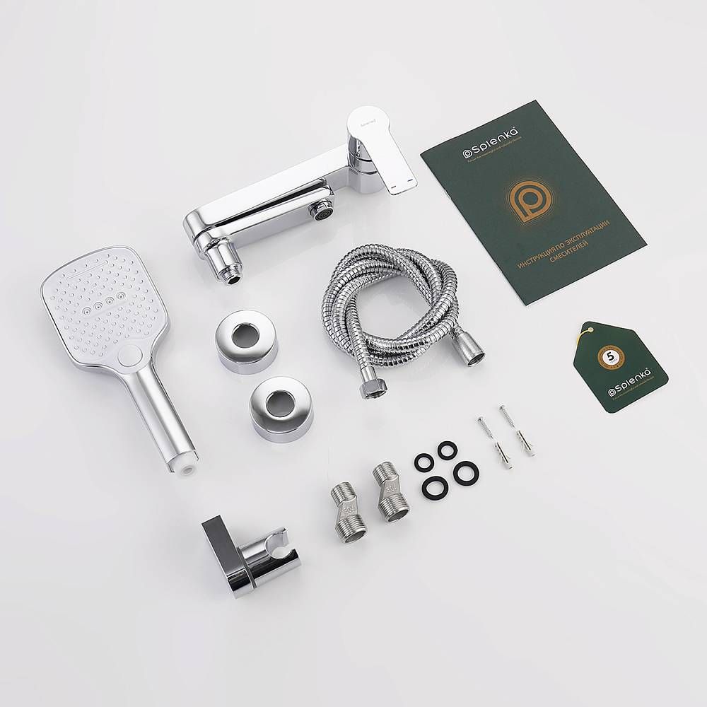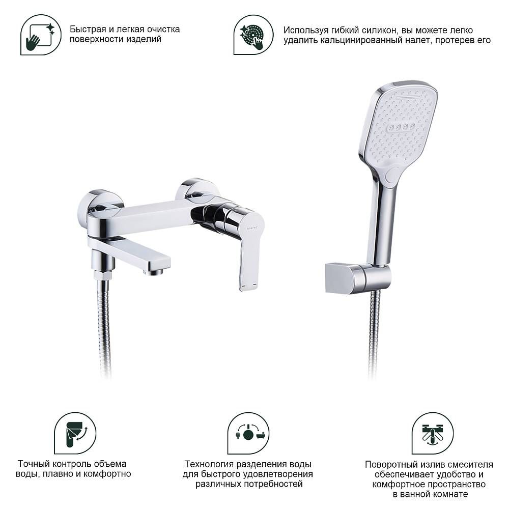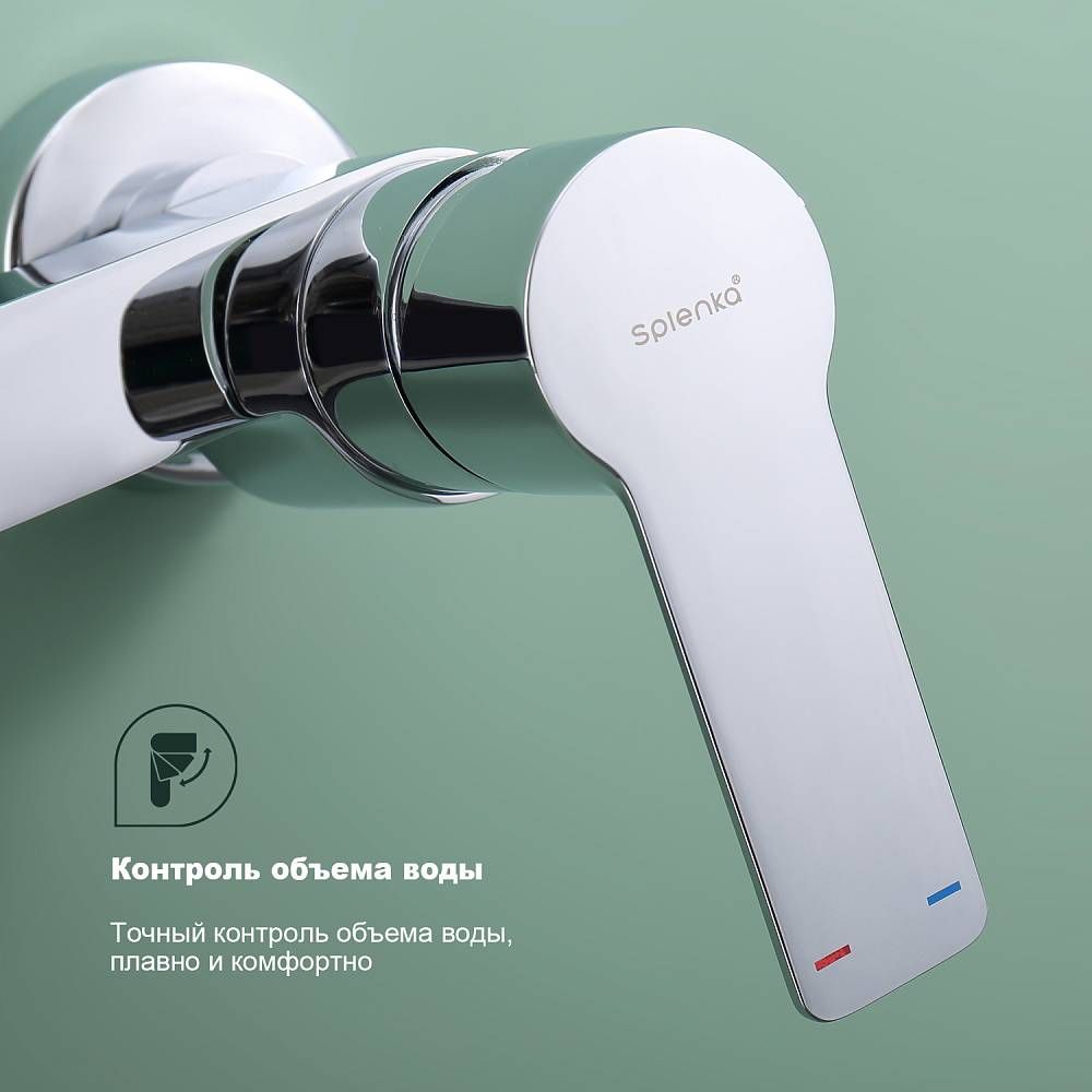 Смеситель для ванны Splenka S06.30, хром. Материал: латунь. Управление: однорычажное. Механизм: керамический картридж. Излив: поворотный. Стандарт подводки: G 1/2. Аэратор. Монтаж: на стену. Душевая лейка - 3 режима.