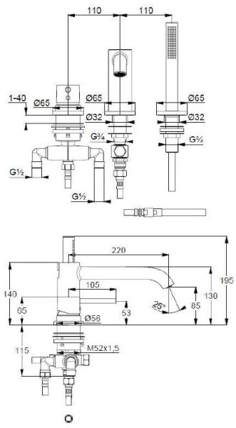 - однорычажный смеситель для ванны и душа DN 15