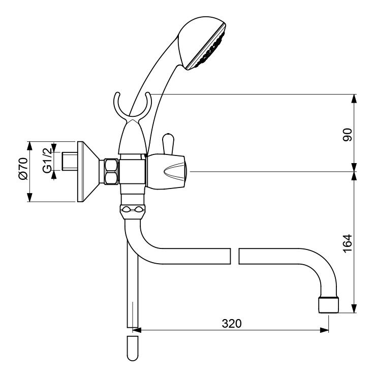ISKAR Настенный смеситель для ванны/душа с поворотным изливом 320 мм, с душевым гарнитуром (душевая лейка Ø70 мм, металлический шланг 1500 мм, держатель для лейки типа Fork), ручное переключение ванна/душ.