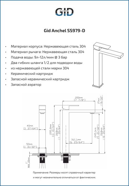 Смеситель высокий для раковины Gid Anchel SS979-BM-D SS979BMD черный матовый купить
