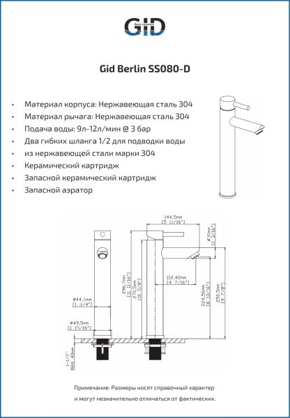Смеситель высокий для раковины Gid Berlin SS080-CH-D SS080CHD хром