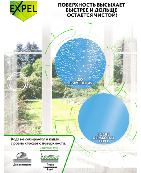 Это инновационное средство демонстрирует современный взгляд на уборку в доме, существенно сокращая её продолжительность и необходимую частоту, тем самым высвобождая время для ваших увлечений.Состав спрея EXPEL АНТИДОЖДЬ - результат синергии научного прогресса и передовых технологий. Спрей не только отлично удаляет грязь, но и модифицирует поверхность стекла - делает её гидрофильной. Состав усилен особыми полимерами, которые создают тонкий невидимый защитный слой на поверхности. Он не дает остаткам воды собираться в капли, что обеспечивает равномерное высыхание без пятен и разводов.С EXPEL грязь и пятна улетучиваются!