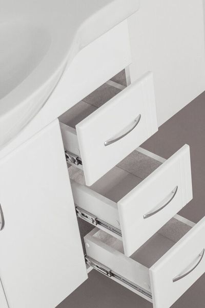 Тумба напольная бренда "Style Line" Эко Стандарт 25 с 3 ящиками. Фурнитура - хром, эксклюзивный декор "Луино" - ламинация внутренней стороны изделия. Направляющие полного выдвижения Hettich; сборка изделия с помощью эксцентриковых стяжек Hafele; все материалы полностью влагостойкие. Данная тумба предусматривает открытую подводку воды