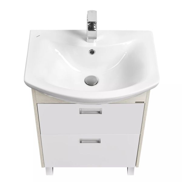 Пространство тумбы шириной 60 см разделено на два вместительных ящика полного выдвижения. Тумбы установлены на металлические ножки и укомплектованы практичными врезными ручками, которые очень удобны в использовании. Боковые стенки и фигурная планка под раковиной изготовлены из ламинированной, текстурированной влагостойкой ЛДСП в цвете дуб сомерсет, а фасады - из крашеной в белый цвет влагостойкой ЛДСП.