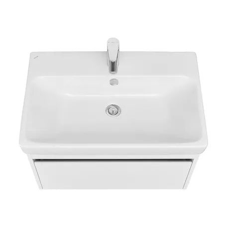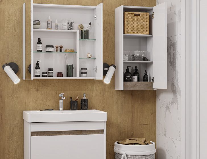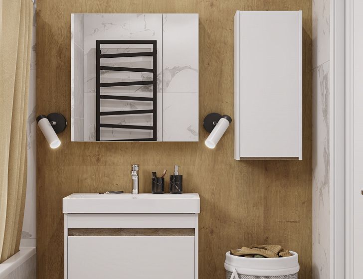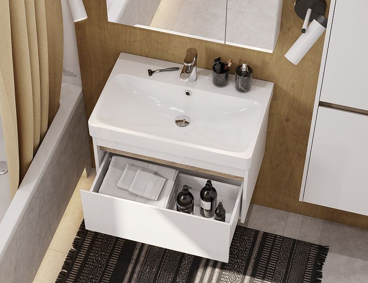 Тумба МАРТИ 70 отличается вместительностью и удобством в использовании: при желании в ящике можно организовать хранение не только шампуней и кремов, но и, например, полотенец. При этом тумба МАРТИ смотрится интересно благодаря выпилу на фасаде, который позволяет открывать тумбу за фасад: в углублении видна контрастная вставка в древесной отделке. Эта акцентная деталь придает модели графичность и позволяет подчеркнуть правильные пропорции тумбы. Корпус и боковые стенки изготовлены из влагостойкой ламинированной ДСП, окрашенной в белый цвет специальной краской ультрафиолетового отверждения для защиты мебели от влаги в условиях ванной комнаты. Декоративная вставка в цвете дуб эндгрейн.