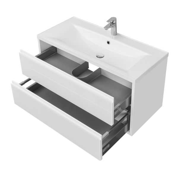 - Оба металлических ящика в тумбе снабжены направляющими полного выдвижения с системой демпфирования - мягкого закрывания австрийского производителя GRASS