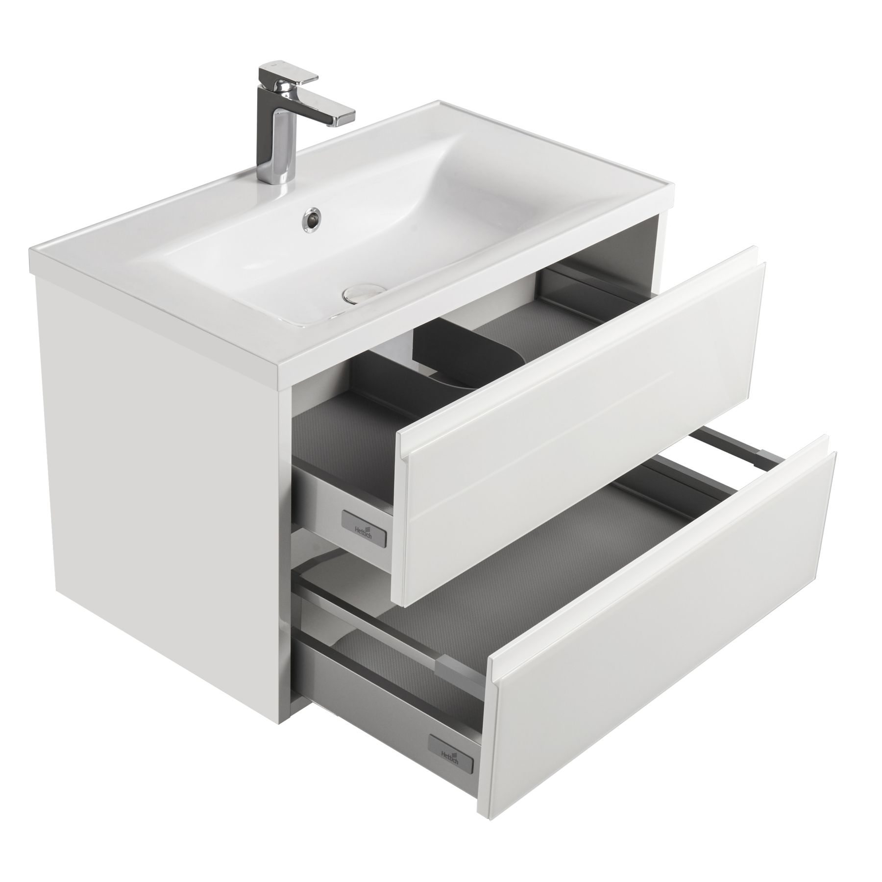 - Оба металлических ящика в тумбе снабжены направляющими полного выдвижения с системой демпфирования - мягкого закрывания австрийского производителя GRASS