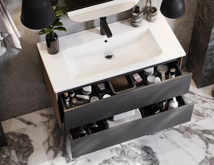 Тумба Сохо 100 функционально состоит из двух вместительных ящиков, оснащенных системой push to open, обеспечивающей надежное, комфортное и бесшумное закрывание. Фасады изделия – МДФ в пленке графит с эффектом soft touch, корпус – ламинированная влагостойкая ДСП Дуб веллингтон. Верхний и нижний ящики оснащены системой организации пространства, которая позволяет содержать косметические средства в идеальном порядке. Дополняет тумбу стильная раковина Элина от бренда Santek с удобной чашей. Все внутренние детали тумбы выполнены в тон фасадов – цвета антрацит