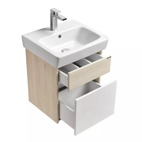 Подвесная тумба под раковину Верди 50 от AQUATON - функциональное и практичное решение для ванных комнат и санузлов со скромными габаритами. Компактная модель с комбинированной отделкой не занимает много места и позволяет разместить всё необходимое. Минималистичный дизайн подчеркивает отсутствие лицевой фурнитуры. Верхний фасад и корпус тумбы изготовлены из ламинированной, текстурированной влагостойкой ЛДСП в цвете ясень фабрик. Нижний фасад выполнен из МДФ и окрашен в белый цвет высокой степени глянца. Конструкция верхнего ящика подвесных тумб разделена на две секции, что очень удобно для хранения мелких предметов. Глубокий и вместительный нижний ящик предназначен для более габаритных предметов.