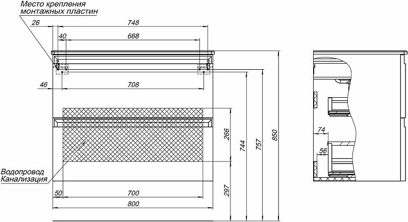 Габариты корпуса тумбы (ШхВхГ): 800х634х460 мм.