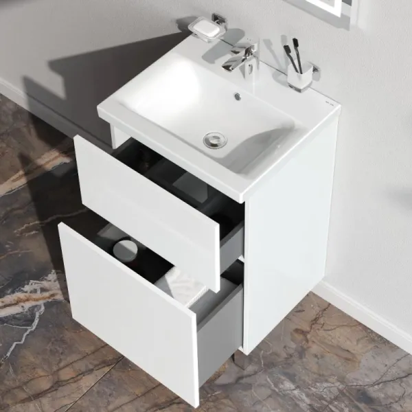 Тумба под раковину Am.Pm Gem M90FSX0502WG белый 50 смТумба под раковину Am.Pm Gem 50 M90FSX0502WG напольная, белый, глянец. 2 ящика (внутри в цвете антрацит с антискользящим эффектом). В верхнем ящике органайзер для хранения гигиенических принадлежностей. Фурнитура push-to-open - открытие ящика легким нажатием на фасад. Направляющие скрытого монтажа обеспечивают плавное выдвижение ящиков. Комплектация: тумба под раковину, комплект ножек, инструкция