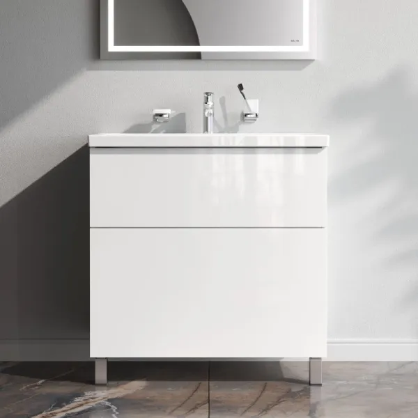 Тумба под раковину Am.Pm Gem M90FSX0802WG белый 80 см Тумба под раковину Am.Pm Gem 80 M90FSX0802WG напольная, белый, глянец. 2 ящика (внутри в цвете антрацит с антискользящим эффектом). В верхнем ящике органайзер для хранения гигиенических принадлежностей. Фурнитура push-to-open - открытие ящика легким нажатием на фасад. Направляющие скрытого монтажа обеспечивают плавное выдвижение ящиков. Комплектация: тумба под раковину, комплект ножек, инструкция