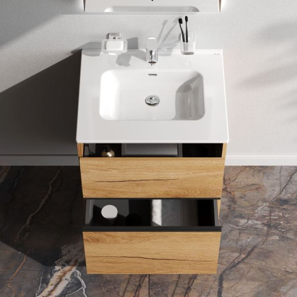 Два вместительных ящика на направляющих Soft-close скрытого монтажа, которые обеспечивают плавное и бесшумное открывание и закрывание - использование тумбы максимально комфортное. Элегантная черная акцентная металлическая профильная ручка придает изделию современный и стильный вид, подчеркивая его уникальность. Самые популярные цвета: белый глянцевый для создания светлого и воздушного пространства, и под натуральное дерево, который добавит тепла и уюта в ваш интерьер.