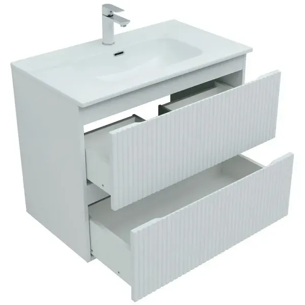 Тумба под раковину Aquanet Джейн (Flat) 80 белый матовый — практичное и стильное решение для ванной комнаты. Корпус и фасады изготовлены из МДФ, покрытого суперматовой пленкой ПВХ повышенной прочности с эффектом «Soft touch». Покрытие не только приятное на ощупь, но и надежно защищает мебель от влаги. Полимерная структура пленки не пропускает воду, поэтому тумба не деформируется со временем и сохраняет первоначальный вид.