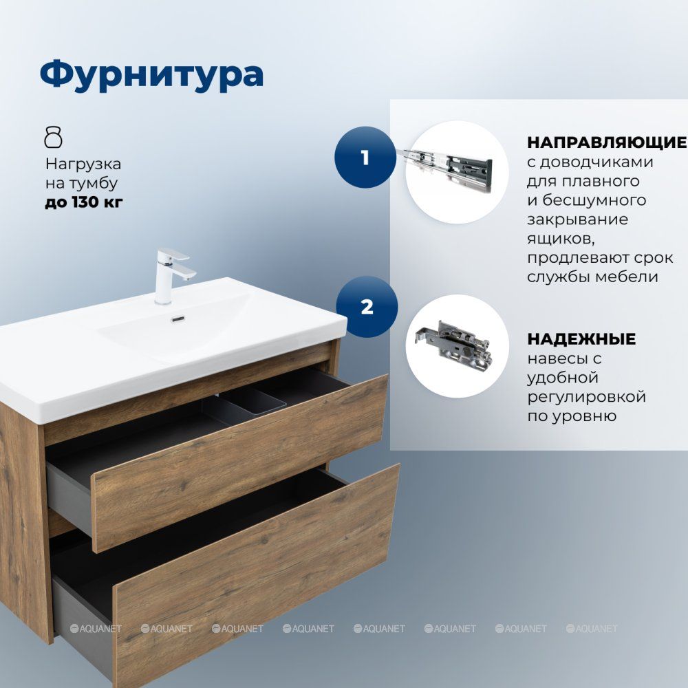 Стильная и практичная тумба для ванной комнаты с продуманной конструкцией. Модель Aquanet Nova Lite 2.0 100 выполнена в цвете дуб рустикальный – матовое покрытие имитирует фактуру натурального дерева и не оставляет отпечатков пальцев.
