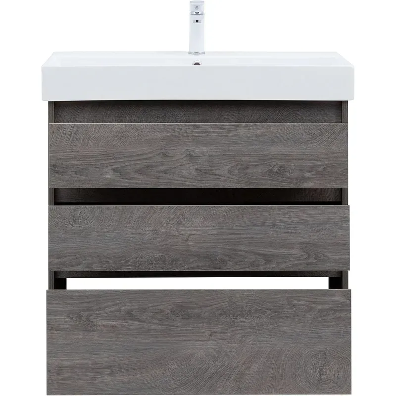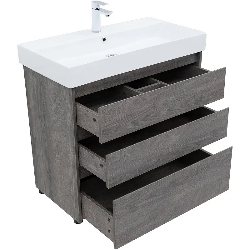 Тумба под раковину Aquanet Nova Lite 85 в исполнении дуб рошелье — идеальный вариант для дополнения ванной комнаты в любом из современных стилей. Лаконичный дизайн с претензией на натуральность позволяет освежить санузел смелым решением. Компактные размеры 820*736*435 мм подойдут как для малых помещений, так и для просторных. Напольная модель оснащена ножками и тремя выдвижными шкафами. Пространство внутри организовано для хранения вещей и бытовой химии с учетом коммуникаций для водоотведения. Корпус и фасад мебели изготовлены из влагостойкого ЛДСП, который препятствует образованию плесени и грибка при длительном взаимодействии с водой и влажным воздухом. Выдвижные шкафы оснащены механизмом доведения, что обеспечивает плавное закрытие. В комплект к тумбе можно купить подходящую по размерам керамическую раковину от Sanovit, например модель Slim Synergy, которая легко подсоединяется к мебели.
