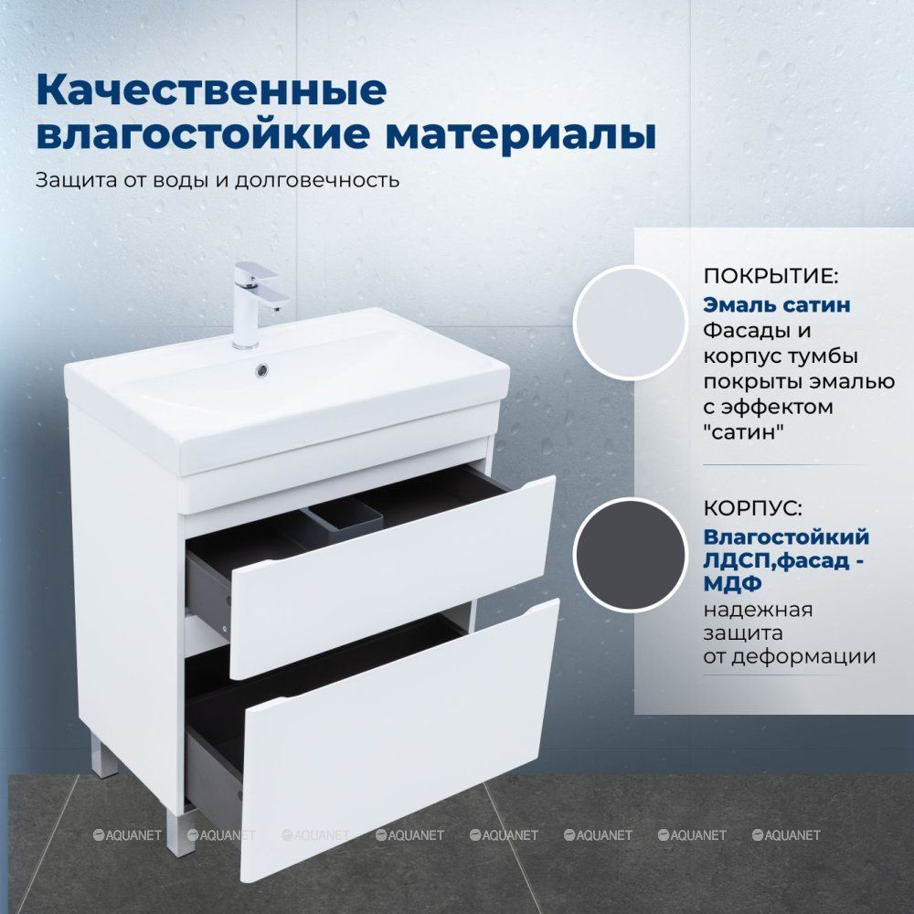 Тумба под раковину Aquanet Слим 70 напольная, белый сатин – компактное и функциональное решение для ванной комнаты. Она сочетает лаконичный дизайн и продуманные детали. Глубина тумбы с раковиной составляет 405 мм, что делает её удобной даже для небольших помещений.