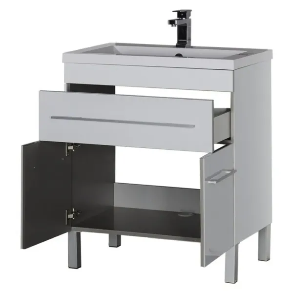 Тумба напольная с раковиной серии Верона с покрытием из качественного акрила — такая отделка придает эффектности внешнему виду и повышает уровень влагозащиты. Применение акрила в производстве мебели для ванных — уникальное предложение, созданное на специализированной линии предприятия. Нейтральный цвет универсален, потому мебель Верона можно совмещать с любыми оттенками в интерьере и разнообразием креативных идей. Экстравагантная геометричность формы подчеркнута горизонтальными линиями фурнитуры ручек выдвижных ящиков. Их вместительное пространство обеспечит дополнительное место хранения банных принадлежностей.