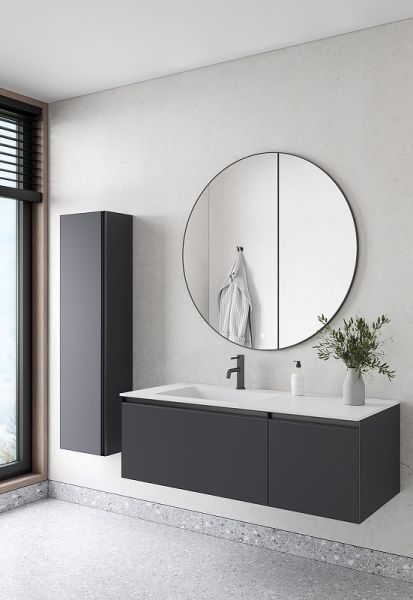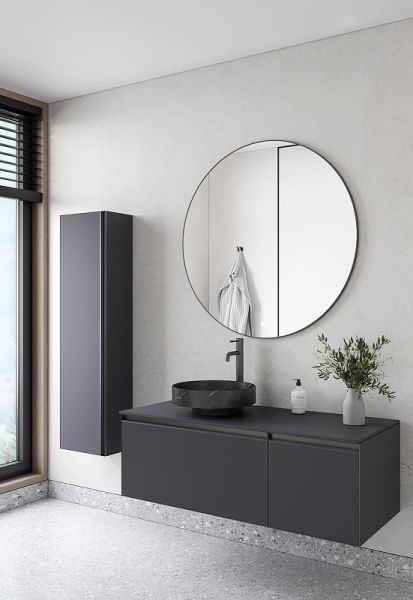 Главной особенностью коллекции являются обрамления фасадов из алюминия в самых трендовых цветах: графит, матовое золото, матовый черный и серебро. Эти обрамления идеально дополняют сантехнику в ванной комнате.