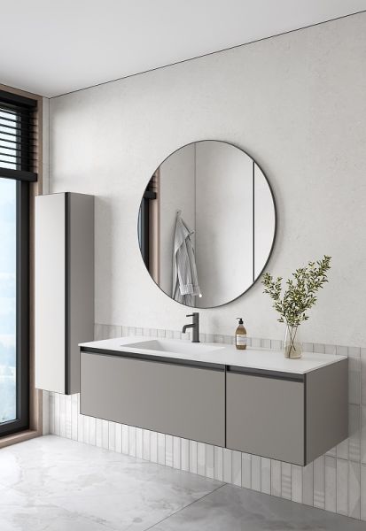 Главной особенностью коллекции являются обрамления фасадов из алюминия в самых трендовых цветах: графит, матовое золото, матовый черный и серебро. Эти обрамления идеально дополняют сантехнику в ванной комнате.