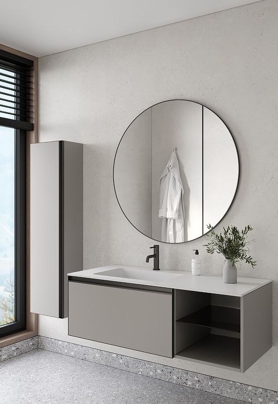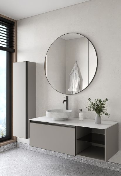 Главной особенностью коллекции являются обрамления фасадов из алюминия в самых трендовых цветах: графит, матовое золото, матовый черный и серебро. Эти обрамления идеально дополняют сантехнику в ванной комнате.