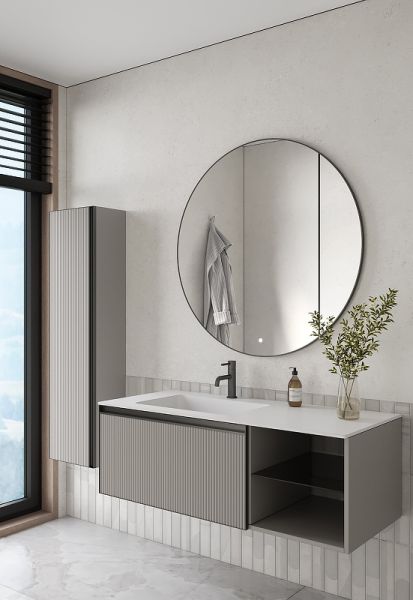 Главной особенностью коллекции являются обрамления фасадов из алюминия в самых трендовых цветах: графит, матовое золото, матовый черный и серебро. Эти обрамления идеально дополняют сантехнику в ванной комнате.