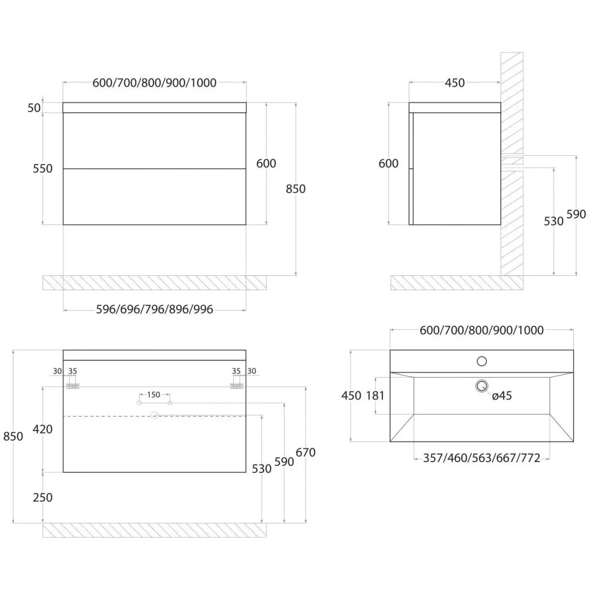 База под раковину подвесная с двумя выкатными ящиками, 800x450x550, AM-Verona-Push-800-2C-SO-KD