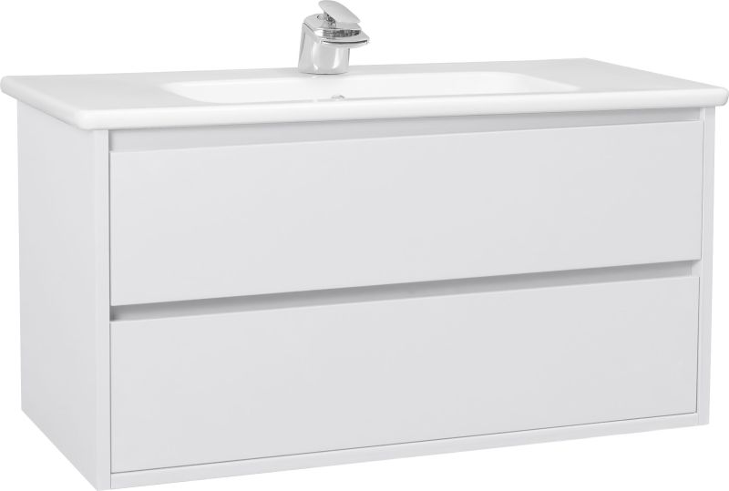 Интегрированная раковина из фаянса: Гладкая поверхность устойчива к загрязнениям, царапинам и известковому налету, а белый цвет гармонично сочетается с глянцевым фасадом тумбы.