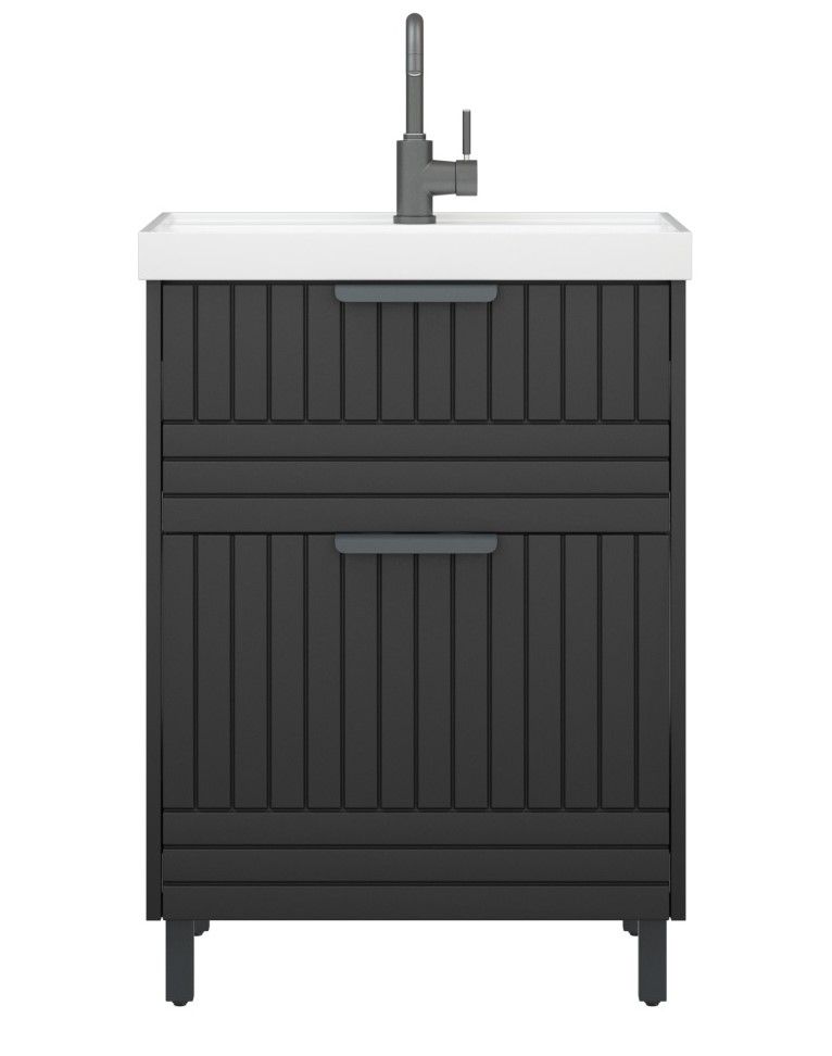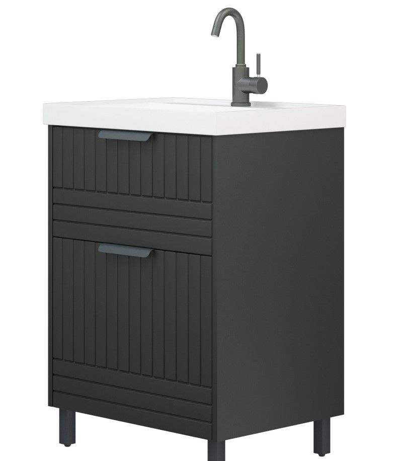 Тумба для раковины Corozo Терра 60, люкс матовый графит, SD-00001324У тумбы коллекции "Терра" 2 выдвижных ящика. Направляющие с доводчиками. Фасад и корпус выполнены из влагостойкой плиты МДФ. В комлекте 4 металлические опоры. Ручки и опоры выполнены из металла цвета "Черный муар".