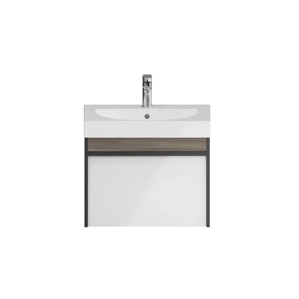 Мебель MODULA может быть использована для установки как мебельных раковин, так и любой из накладных, которые в этом случае устанавливаются на керамическую столешницу CANALETTO. Боковины тумбы выполнены в цвете «Арабика», фасад — белый глянцевый.
