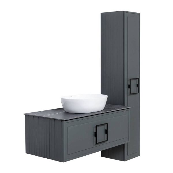 Тумба под раковину La Fenice Cubo FNC-01-CUB-G-100 97.6 смПодвесная тумба La Fenice Cubo FNC-01-CUB-G-100 обладает рядом неоспоримых преимуществ. Тумбу можно оснастить встраиваемой раковиной (арт.CU.NN.100), либо же приобрести столешницу в подходящем цветовом решении (арт. FNC-03-PL01-100, FNC-03-VS03-100) и установить на неё раковину-чашу. К данной тумбе необходимо выбрать один из трех цветов ручки (FNC-04-CUB-B-168 - белая; FNC-04-CUB-N-168 - черная; FNC-04-CUB-C-168 - хром), ручка включена в стоимость тумбы. За счет входящего в комплект сифона Prevex, тумба обладает полноценным ящиком для хранения (без выреза). Ящик выполнен в фантазийной цветовой гамме "Лён антрацит". Тумба оснащена скрытыми доводчиками плавного закрывания частичного выдвижения Samet (Турция) и подвесным регулируемым механизмом Camar (Италия). Фасад и корпус тумбы покрыты краской и матовым лаком, что является надёжной защитой от влаги. Прекрасным и функциональным дополнением к тумбе станет пенал La Fenice Cubo серо-зеленого цвета FNC-05-CUB-G-30