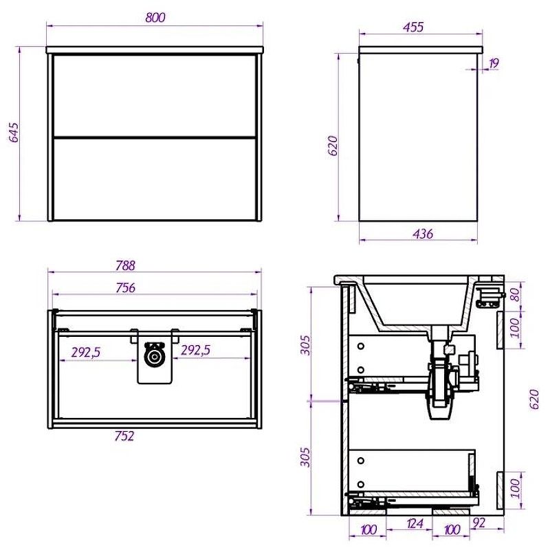 Габариты корпуса тумбы (ШхВхГ): 788х620х436 мм.