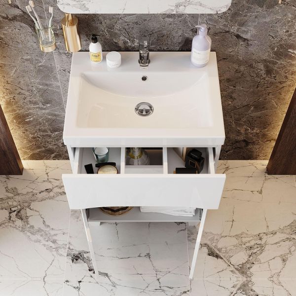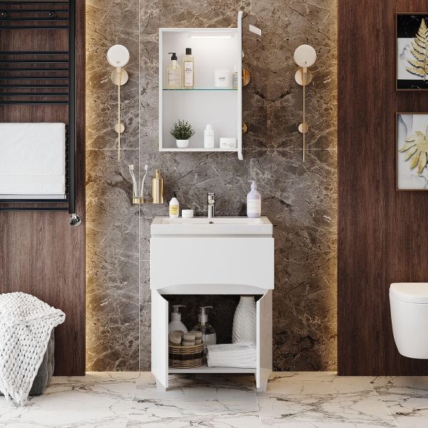 Яркая эстетика строгих линий и блестящий белый глянец - тумба Onika Стрим 60 создана, чтобы наполнить пространство воздухом и сделать особенный свободный интерьер комнаты.