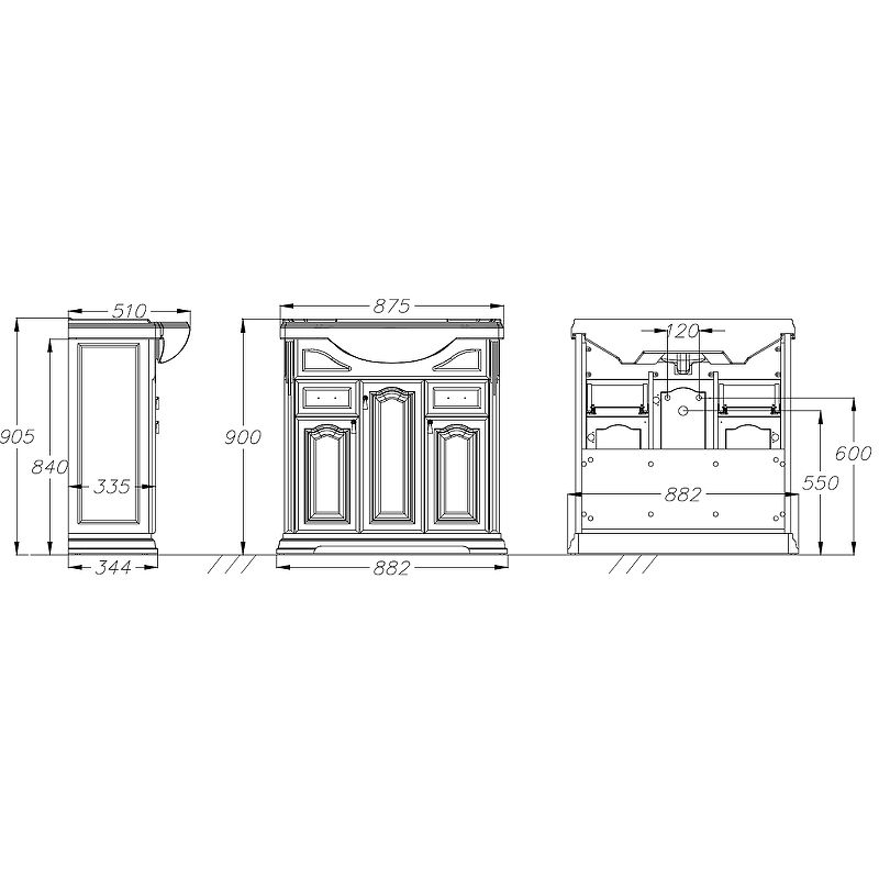 Габариты корпуса тумбы (ШхВхГ): 882х840х344 мм.