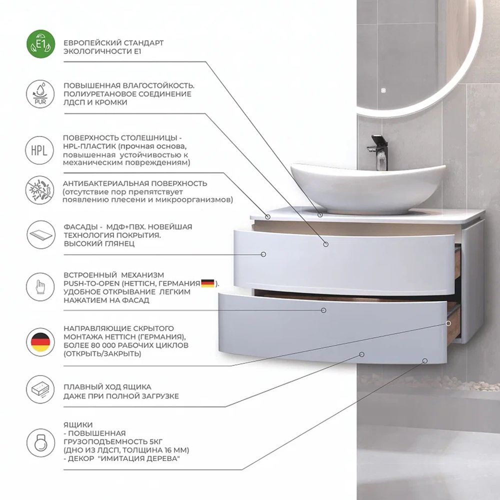Тумба под раковину подвесная Velvex Luna tp.LUN.60.2Y, 60 см: 2 выдвижных ящика с механизмом открывания push-to-open.