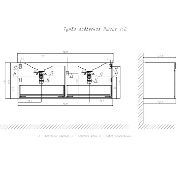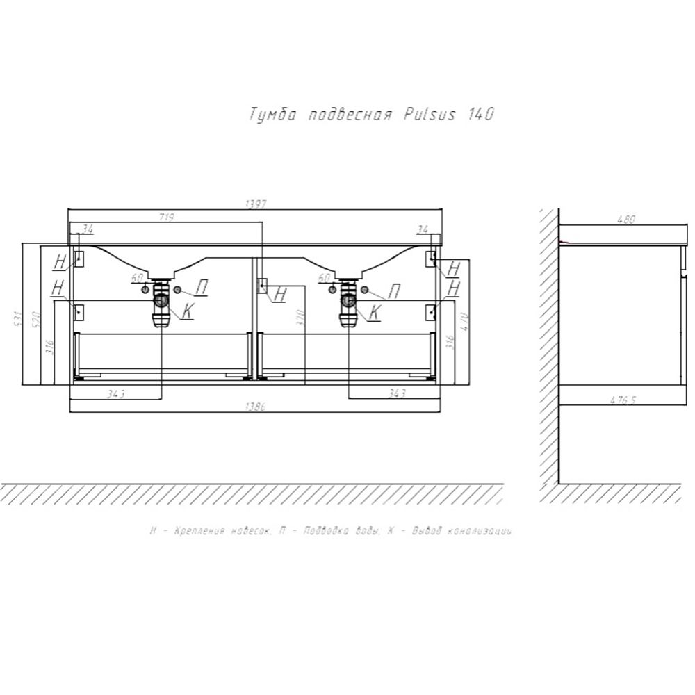 Тумба под раковину подвесная Velvex Pulsus tp.PUL.PUL.140.2Y дуб сонома, 140 см: 2 выдвижных ящика.